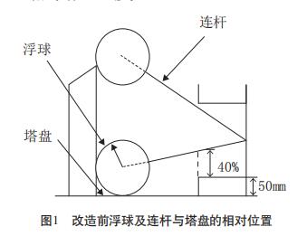 自我公司常減壓裝置投用以來,由于儀表安裝位置設計得不合理,儀表開孔位置距離塔盤太近,僅為50mm,致使減壓塔中部溢流槽液位儀表無法正常使用,測量范圍小。為了滿足工藝要求,進行問題原因和解決方法分析與改造實踐。在本次改造前,浮球及連桿與塔盤的相對位置如圖1所示。由于受安裝位置以及浮球自身結構的制約,當塔盤內的液位為零時,浮球的位置為下虛線所指;當塔盤液位溢流時,浮球的位置為上虛線所指。但當液位為零時,此時浮球的狀態(tài)并不是儀表示值為零所要的位置,而是處于其示值40%的位置。這樣即便是塔盤內沒有液體,儀表也有40%的指示。這樣的顯示就會給工藝帶來假信號,使操作人員產(chǎn)生錯誤判斷,影響操作。